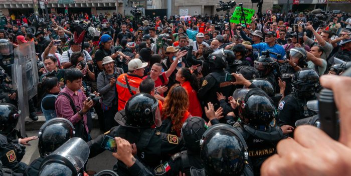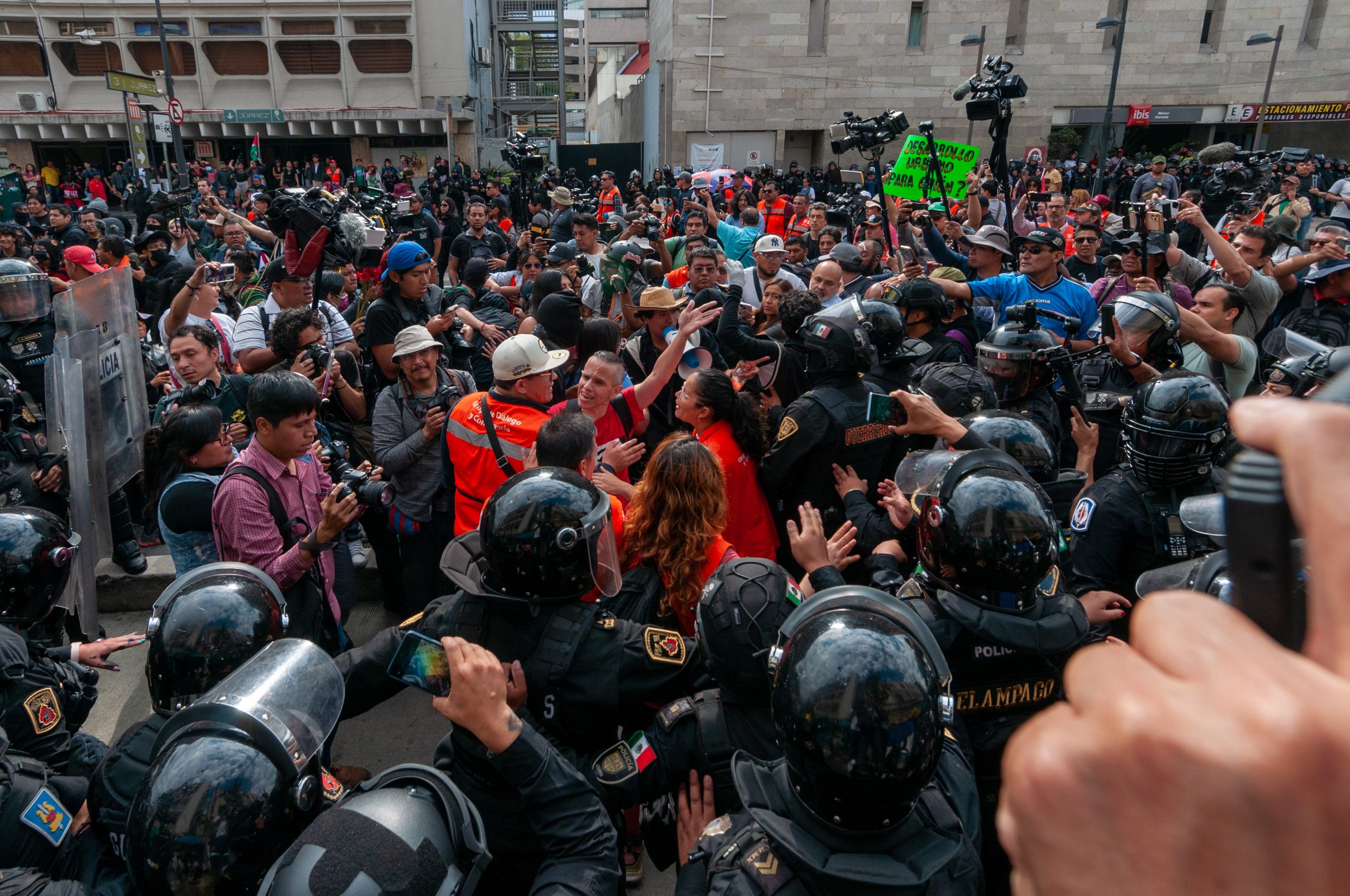 Del lado de los manifestantes, también se construía una ficción que me parecía muy particular: emular al arquetipo del revolucionario. Sentí por varios momentos que sobredimensionaron hechos aislados y particulares, como los choques; el actuar dos policías: ambos se atrevieron a grabar y eso detonó breves incendios que fueron apagados por los cuerpos naranjas del gobierno; o elevar a rango de represión los forcejeos esporádicos, el encapsulamiento y el último encontronazo a las afueras del metro Juárez. Tampoco le lavaré la cara a una institución que históricamente ha sido el brazo oficial de represión y que ha actuado con criminalidad e impunidad en no pocas ocasiones, pero aquí, hoy, no hubo sangre, toletazos, detenciones ni órdenes directas para reprimir a la vieja usanza. También tampoco. Hubo dos bandos que difícilmente se podían comunicar con un árbitro naranja de por medio.